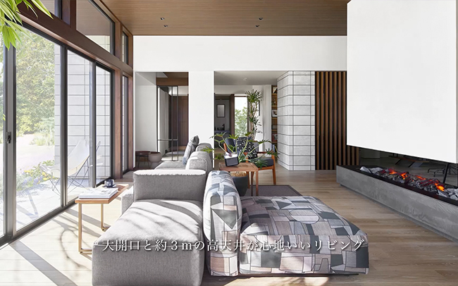 くつろぎのLDKは三面に大開口が連続し、約3mの高天井と相まってひときわ開放感を生み出しています。中央に配置された電気水蒸気式の暖炉で、身も心もほっこりと温まりそう。キッチンは家族みんなで料理が楽しめるⅡ型のオープンスタイル。しかもスイッチワークスペース付きだから、家事と仕事の両立もスムーズです。さらにリビングとゆるやかにつながる学びの場「ホームコモンズ」もあり、在宅ワークはもちろん、お子さまのリモート授業や自宅学習にも活躍します。 個室にこもって仕事に集中したいときは2階のワークスペースへ。隣接するフィットネスルームでステイホームの運動不足が解消できるのもうれしい配慮。高い壁一面の本棚&大階段を活用したホーム図書館や、備蓄や防災用品の収納に使える大収納空間「蔵」もあり、家時間がぐんと充実しそうです。すぐれた性能面も見逃せません。南極・昭和基地の建物建築で培った技術を活かした120mm厚木質パネル「センチュリーモノコック」構法や、制震装置「MGEO」による高耐震・高耐久の住まいだから安心。次世代の省エネ基準であるZEH基準を優にクリアする断熱性能が快適エコの豊かな暮らしをもたらします。