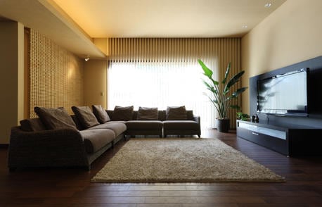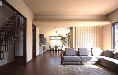 タイで暮らしていたAさまがご帰国後に建てたモダンとエスニックが融合した住まい。緑豊かな約140坪の敷地には、クスノキの巨木がご家族の暮らしを見守るように立ち、つねに自然が身近に感じられます。建物の正面にはウッドデッキ、その右側にはタイル敷きのテラスを設け、外まわりも充実させました。 アジアンテイストのリビングは約17帖大。ダイニングより一段高い3.1mの天井高が開放感を生んでいます。この大空間を引き締めているのが透かしタイルを使ったアクセントウォール。アジアの古い寺院や宮殿をイメージしたものです。