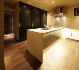 ウォールナットの床とアースカラーの塗り壁で、落ち着いた雰囲気を演出。