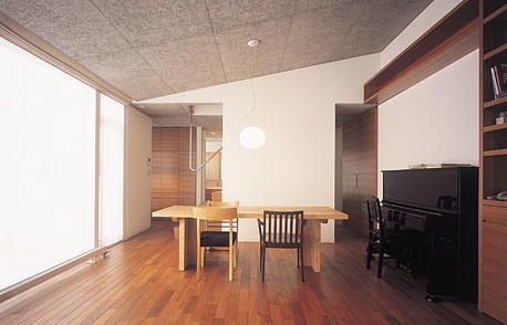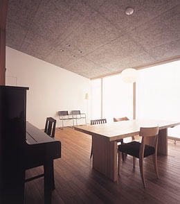 木毛セメント板を用いた、力強さのある勾配天井のあるリビング・ダイニング。
