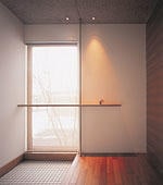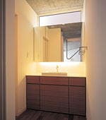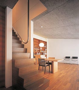 建築デザイナーT氏が、自らの設計思想をカタチにした住まい。3つのボックスを組み合わせたようなシンプルなフォルムですが、その一部分に木材を使ってアクセント的な変化をつけています。 また、壁の面構成をうまく使って、外からは開口部が見えない、スッキリした印象のファサードを実現しました。 その空間は個性的そのもの。倉庫の壁に使われるような木毛セメント板をはじめ、電車の手すりのようなステンレスパイプなど、ユニークな素材を随所に採用。モダンかクラシカルか。和風か洋風かといったジャンル分けが通用しない新たなスタイルが生まれました。