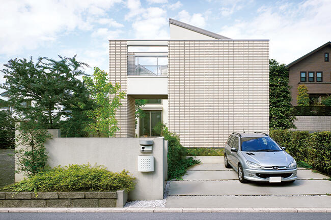 建物正面の大きな壁面と、中庭まで視線が通るルーフバルコニーの対比が魅力的です。