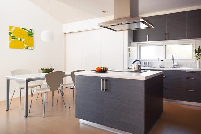 室内にスタイリッシュな雰囲気を生んでいるダイニングキッチン。約11帖ながら、高さ約3.5mの勾配天井が空間をより広く感じさせています。アイランド型のオープンキッチンはプロ感覚。収納扉のカラーやレンジフードのデザインが空間をスタイリッシュな雰囲気に演出しています。IHクッキングヒーターは表面がフラットでスッキリとしている上、火炎がでないので安全性にもすぐれています。