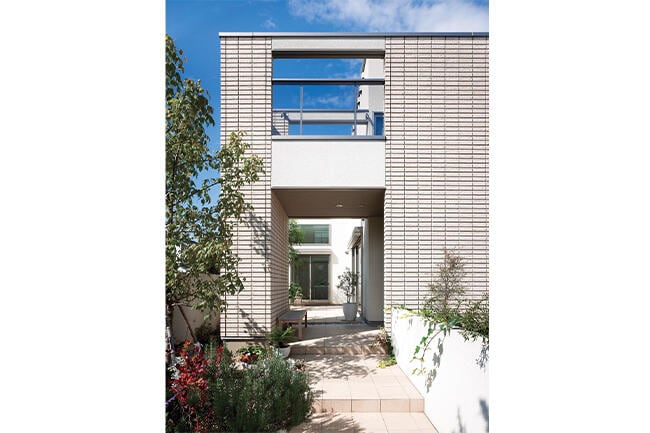 "トンネル"のような構造がユニークな玄関アプローチ。2階バルコニーを兼ねた構造です。