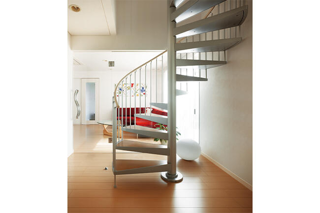 明るい色調、大きな開口、らせん階段で、広がりを演出したリビングルーム。