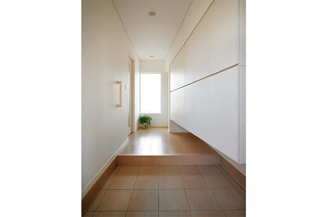 モダンでスタイリッシュなデザインとのびやかな開放感を追求したKさまの住まい。タイルと吹き付けはホワイトで統一し、スクエアなフォルムをより強調した外観に仕上がっています。 道路面に対して大きな壁を仕立てることで、建物が大きく見える堂々としたファサードを表現。それでいて、大きな開口から陽ざしがふんだんに注ぎ込むリビングや寝室は、とても明るく開放感に満ちています。 約32坪(104m²)の延床面積ですが、間取りや内装材選 びの工夫によって、実際以上にのびのびとした開放感が感じられます。