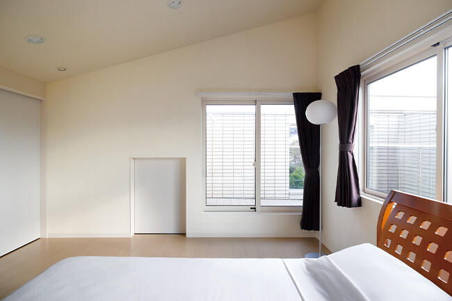 K邸には限られた空間を広く感じさせる工夫があります。一つ目は視線を遮らない設計。大開口やガラス素材を使って、視線を遠くまで通すことで広がりを生んでいます。二つ目は圧迫感のない内装カラー。白を基調に淡いトーンでまとめています。アクセントは家具や雑貨で付けています。三つ目は合理的な間取り。廊下は必要最小限とし、LDKにはらせん階段を設けるなど、スペースの無駄をなくしています。
