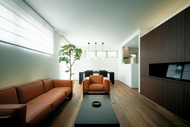 妹であるAさまの「落ち着いた雰囲気の住まいにしたい」というご要望を受け、まずエントランスの一部には御影石を用いて上品でモダンな空間にまとめました。さらに室内の壁は白の漆喰を使ってやわらかな印象に。リビングなどの床や収納扉はオイル仕上げとして、ナチュラルな色合いやマットな質感、しっとりとした肌ざわりなど、自然素材ならではの魅力をいかしています。