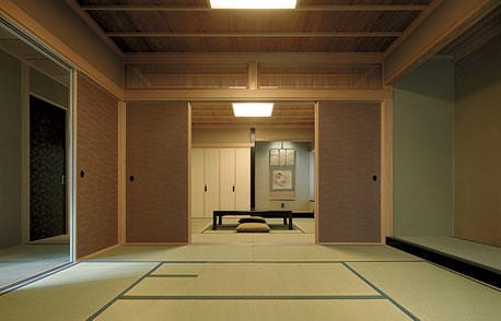 玄関ホールから和室へと続く廊下は、途中で床がフローリングから畳敷きに変わります。この仕掛けが洋から和への心理的なスイッチになり、さらに空間のゆとりが感じられます。また、Nさまの強いご要望だった「和室続き間」は、8帖の仏間と6帖の茶室に。書院風の床の間や二重まわり縁の天井、京唐紙の襖など、自然素材ならではのしっとりとした落ち着きを実現しています。