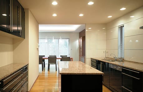 洋ゾーンのLDKは、一転してモダンな雰囲気に、快適さと使いやすさを追求しました。洋の庭に面した大開口からは明るい陽ざしが降り注ぎ、メイプル材のフローリングやブラックチェリー材のアクセントウォールを使った空間にこの上ない心地よさを演出しています。また、キッチンには作業のしやすいアイランドカウンターや、たっぷり収納できるカップボードも設置しています。