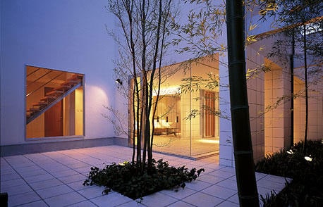 Nさま邸のプライベート空間の象徴といえるのが、約 30m2のパティオです。白い壁と植栽、照明が美しく調和したスペース。ここから住まいの中に光や風を取り込めるだけでなく、各部屋にも視線が気持ちよく通るので、室内がより広く感じらる効果もあります。また、夜はライトアップした光が間接照明のように室内を照らし、心からリラックスできるひとときを演出してくれます。