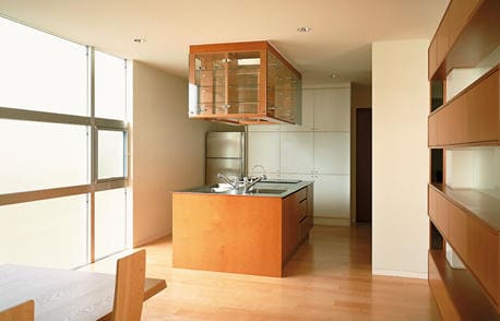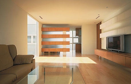 「ふだん仕事が忙しいので、家では心からくつろげる時間がほしい」というNさま。 そこで住まいの設計にあたっては、周囲からの視線を遮るために約5mの壁で囲むとともに、家の中心に広いパティオを設けました。パティオに向かって居室が開かれたことで、光と風を心ゆくまで楽しめる住まいとなりました。 敷地の傾斜を利用した地下1階・地上3階の建物。外観デザインは水平と垂直のラインを整え、シャープな造形美を感じさせますが、美しい風合いの珪藻土を広い面に使うことでやわらかな印象になっています。
