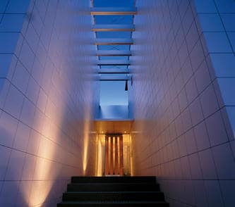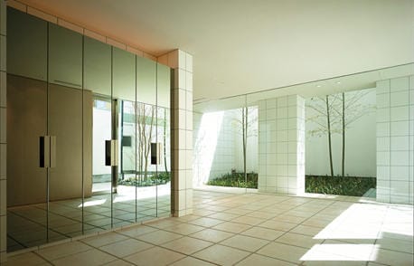この住まいにはお客さまをお迎えする心遣いがすみずみに込められています。たとえば、玄関アプローチ。艶のある白いタイル、高さ約8.5mの壁で囲われた空間は、訪れる人を厳粛にもてなす風格が感じられます。さらに玄関ホールは約24m2という広い接客スペースを確保。ここでゲストと応対することで、1階はパブリックゾーン、2・3階はプライベートゾーンと明確に区別されています。
