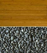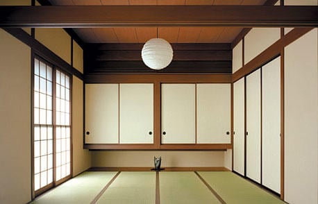 玄関から1階客間までは伝統的な和をベースにモダンなテイストを加えることで、個性的な空間に仕上がりました。玄関は、タタキに玉砂利を敷き詰めて石畳を配し、床に清々しい竹材のフローリングを使用。また、1階リビングにつながる客間は、焦げ茶の柱と梁が広びろとした空間をきりっと引き締め、和紙づくりのペンダントラ イトが空間の美しいアクセントとなっています。