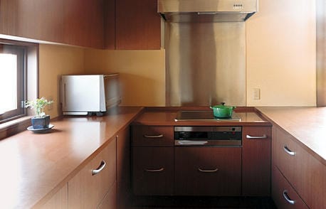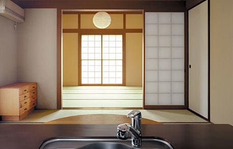 Wさまご夫妻は、和の暮らしやすさに惹かれ"座って生活するスタイル"のリビング・ダイニングをご希望されました。畳敷きの団らん空間は家族の交流にもぬくもりが生まれるようです。また、キッチンは対面式のフルフラットカウンターとしただけでなく、床を約60cm掘り下げて、料理をする奥さまとご家族の視線の高さが合うように配慮。家族の会話が弾み、おいしい時間を広げる提案です。