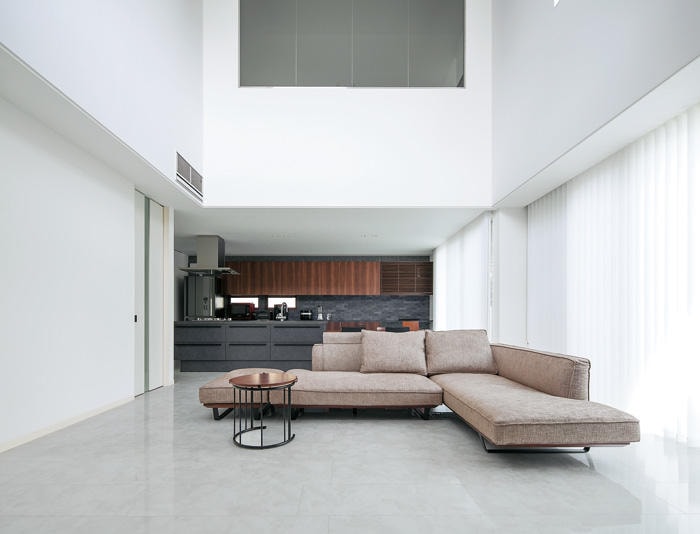[奈良県 Tさま邸] 愛車を眺めながらくつろぐリビング。一枚ガラスが眺めをグレー...