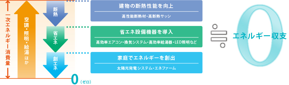 住宅の年間一次エネルギー消費量をおおむねゼロにする「ZEH(ネット・ゼロ・エネルギー・ハウス)」。ZEH仕様の住まいにするためには、断熱・省エネ・創エネの3つの基準を満たす必要があります。