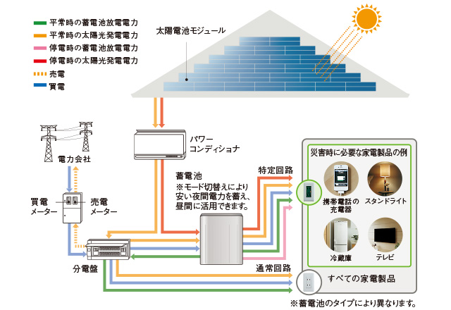 蓄電池と併用することで、エネルギーの自家消費効率がさらにアップ。停電時にも、電力を確保できるから安心です。