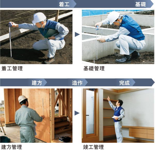 ミサワホームでは、施工段階の品質管理を重視し、「6回管理・6回検査体制」を導入。現場管理者による「地盤補強」「着工」「基礎」「建方」「防水」「竣工」の6回の工程管理、ならびに、専門の検査員による「地盤補強」「基 礎配筋・型枠」「基礎完成」「構造体」「防水」「竣工」の6回検査を実施しています。