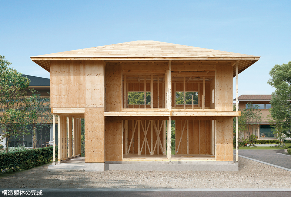 「MJ Wood」は、施工現場でそのまま使用可能な寸法精度の高いプレカット材を採用。接合金物も工場で装着しています。