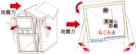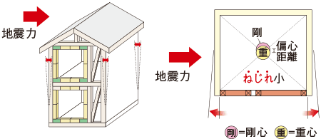 強さの中心「剛心」と重さの中心「重心」の距離(偏心距離)が大きくなると、荷重がかかった際にねじれが大きくなりやすい。
