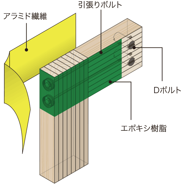 フレームのコーナー接合は、高強度の専用金物やアラミド繊維を採用。